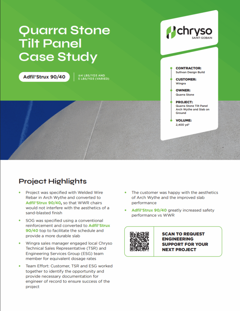 In a project where welded wire rebar was specified, Chryso customer Wingra Stone & Redi-Mix utilized Adfil®Strux to achieve the specific finish that was needed. An additional benefit of utilizing synthetic concrete macro fibers is that it greatly increases safety when compared to welded wire mesh.