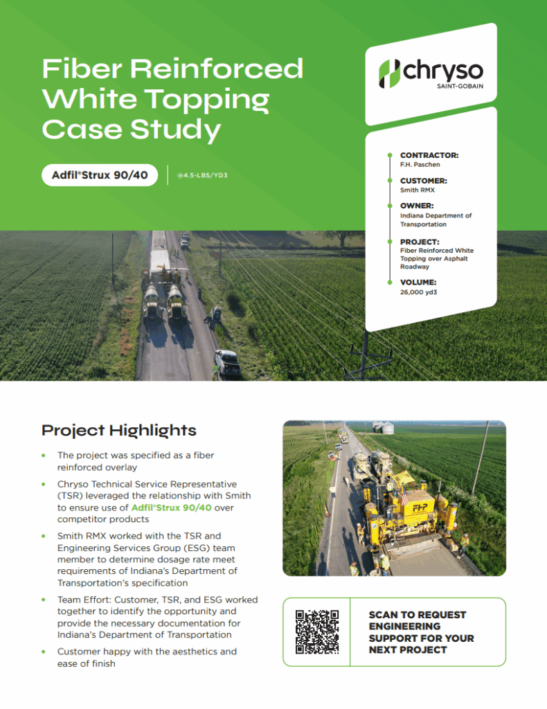 When a lonely Indiana road needed a hashtag fiber reinforced overlay, Chryso customer Smith Ready Mix, Inc. called in ADFIL®Strux 90/40. We worked with the team to determine just the right dosage rate to meet the Indiana Department of Transportation specifications for 26K yd3 of white topping.